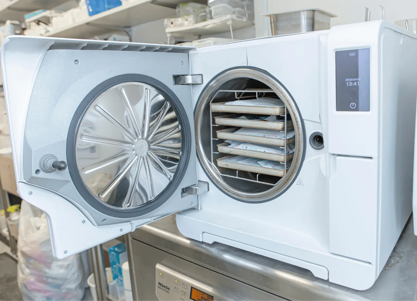 モーターなどの器具を滅菌する専用装置です。内部まで滅菌処理を行うために使用しています。