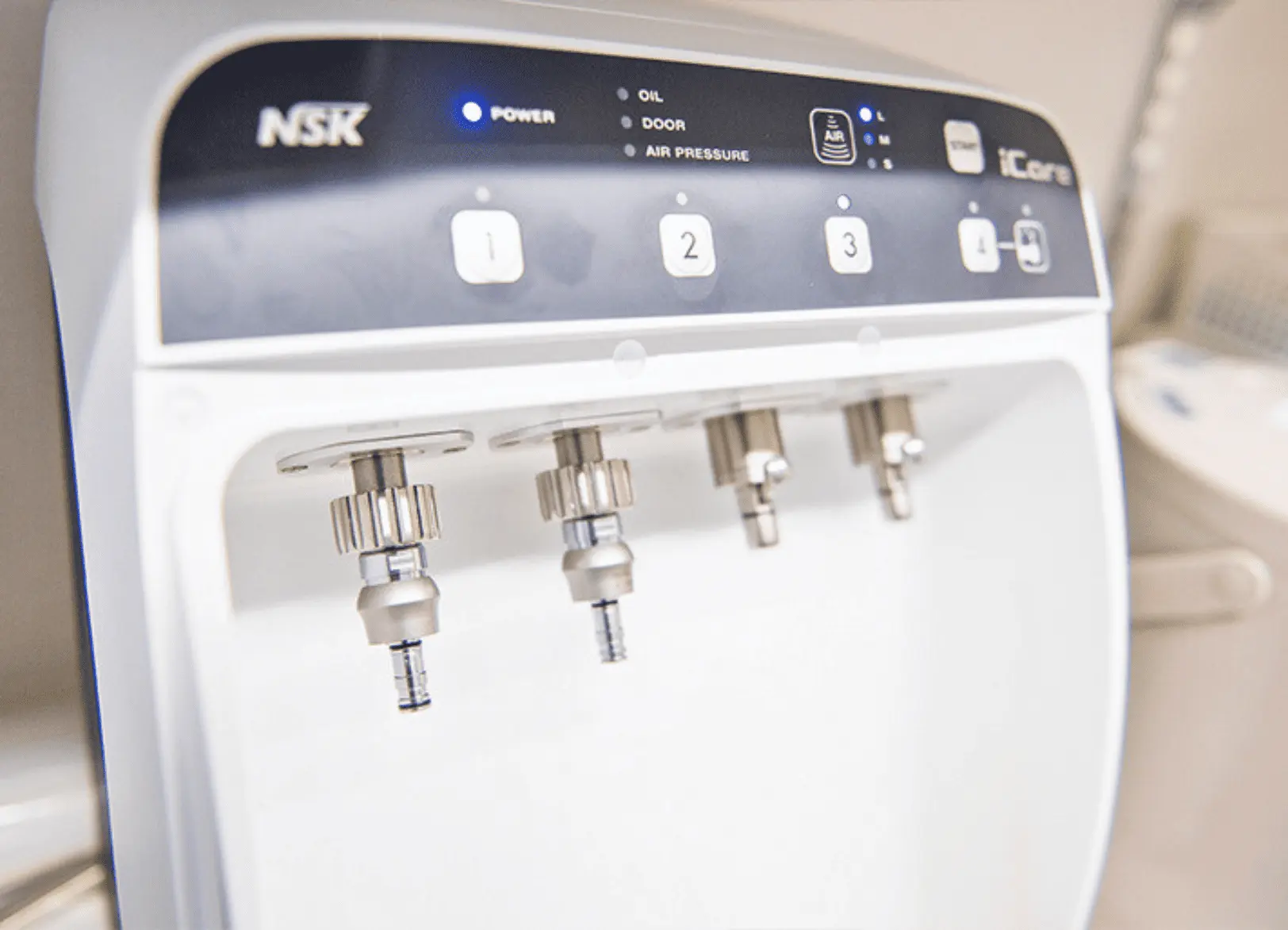 注油機器歯を削る機器(ハンドピース)の内部を自動で洗浄し、注油を行う装置です。内部まで洗浄を行うことで器具の管理に役立てています。